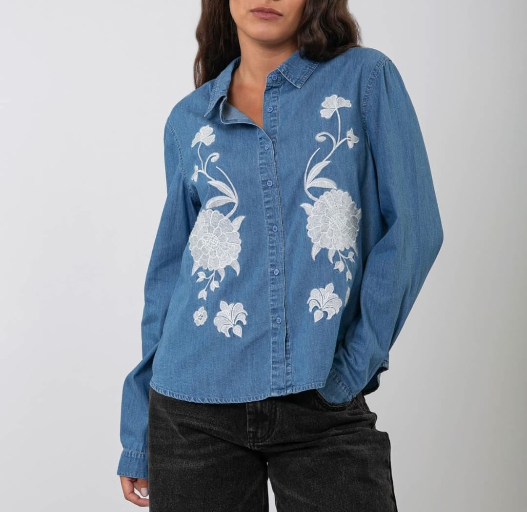 Camisa Elena, confeccionada en suave tela jeans con delicados bordados que la hacen única. Perfecta para elevar tus outfits diarios a otro nivel con un toque casual pero sofisticado. Combínala fácilmente con tus prendas favoritas para un estilo inigualable.