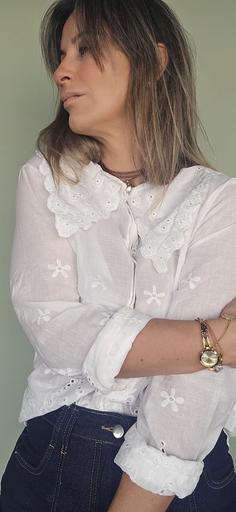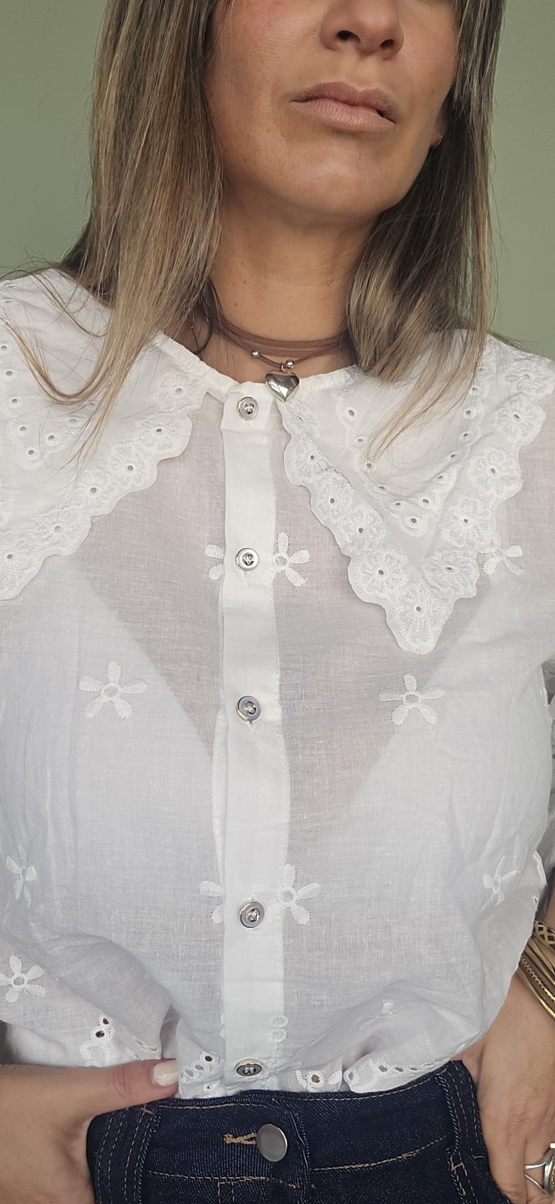 La camisa MAGI, con su cuello de bebé en broderie, es simple y elegante a la vez. Confeccionada con materiales de alta calidad y detalle meticuloso, esta prenda es perfecta para cualquier ocasión. Combínala con pantalones o faldas para un look clásico y sofisticado.