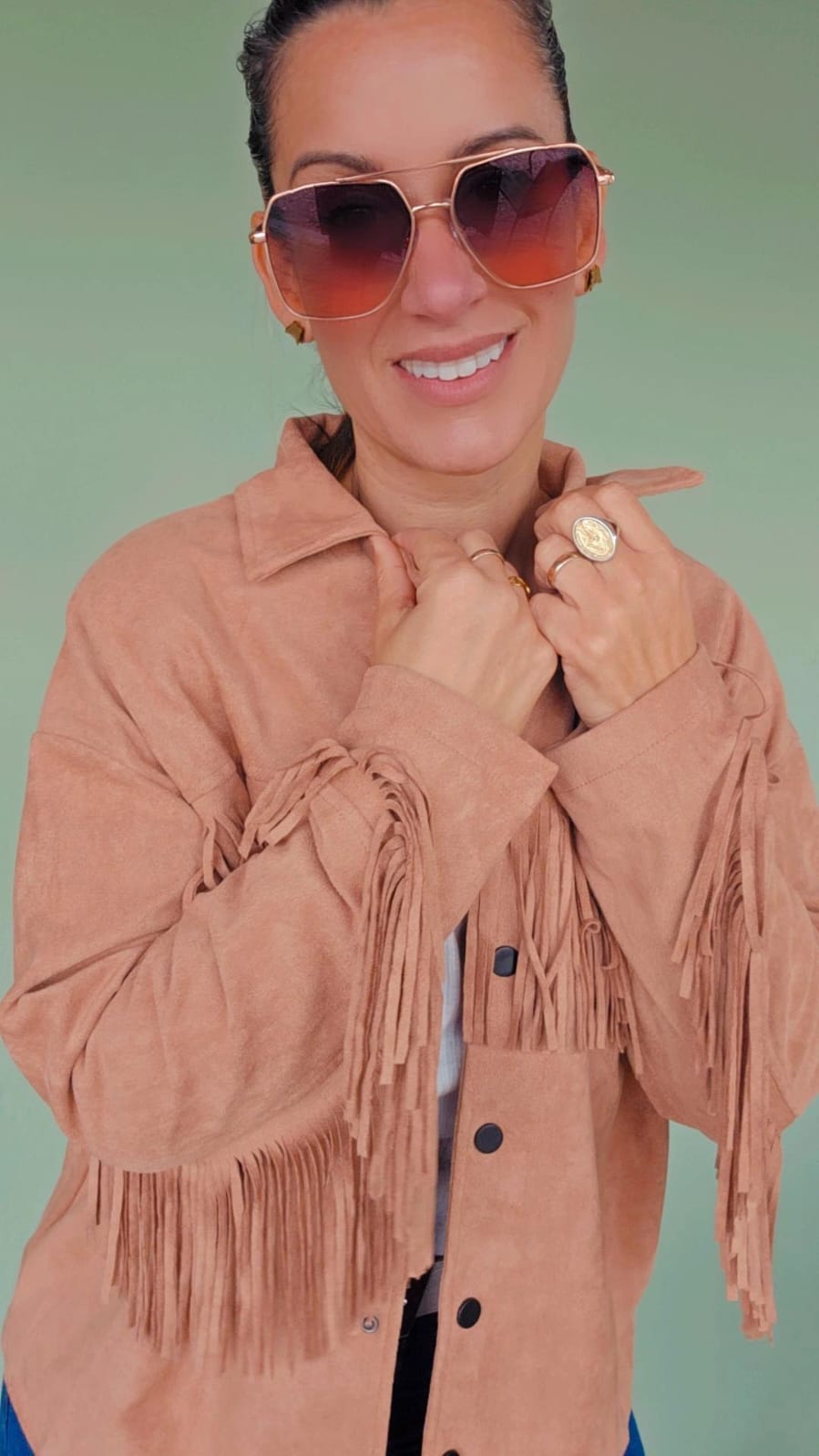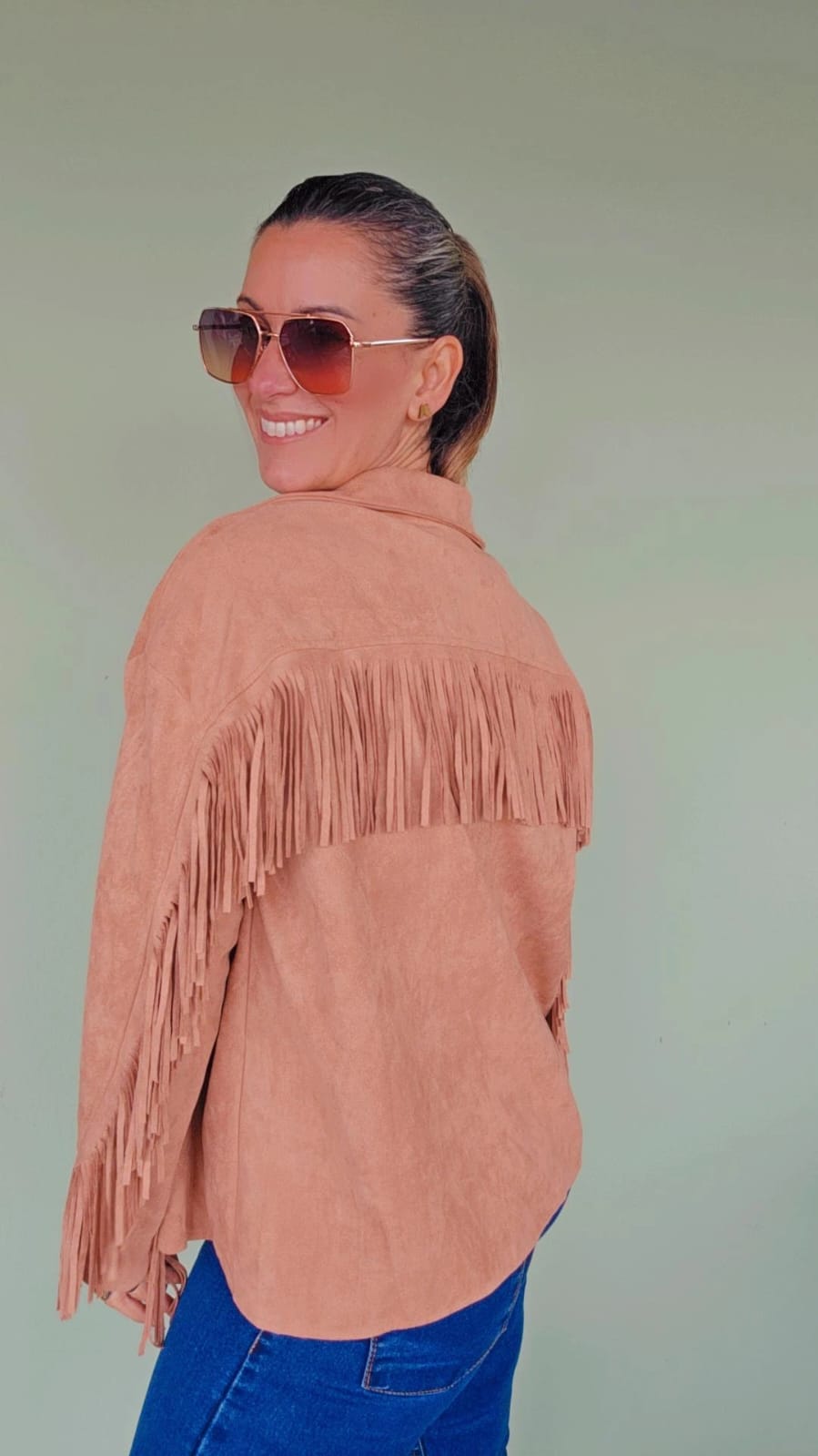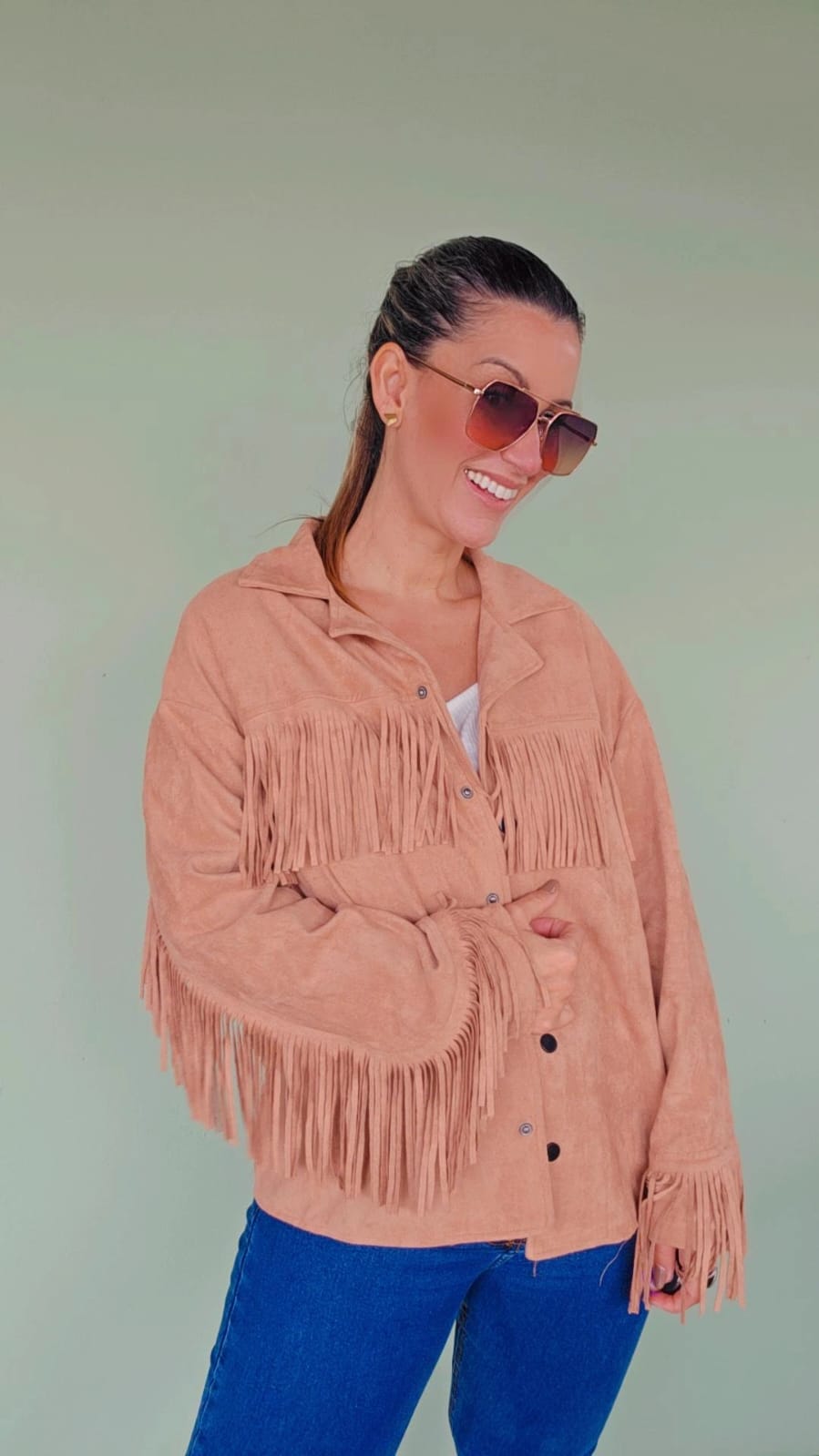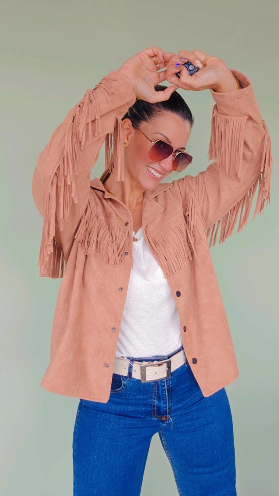 Siente el lujo y estilo exclusivo con nuestra sobrecamisa Texas. Confeccionada en gamuza, esta sobrecamisa estilo vaquera cuenta con elegantes flecos en la espalda y las mangas, brindando un toque artístico a tu outfit. Disfruta de una pieza única que te hará destacar entre la multitud.